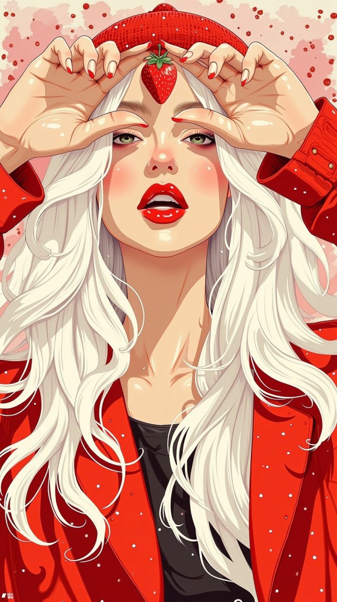 #5. beautiful woman, long wavy white hair styled in loose curls framing her face, red coat, fingers slightly curled, BG blurred, focus on strawberry and woman's lips #role_red
