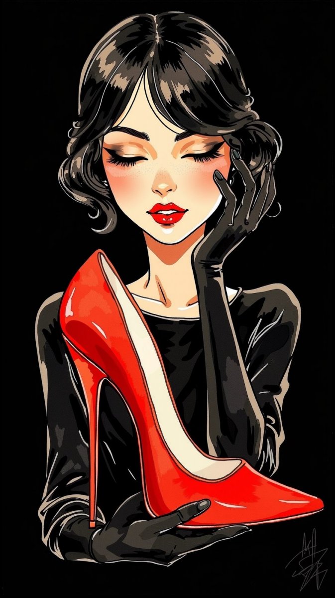 Загадочный портрет молодой женщины, окутанный атмосферой таинственности и элегантной меланхолии. Её лицо, обрамленное тенью, излучает утонченную красоту, а закрытые глаза словно скрывают глубокие переживания или погружают в мир грёз. Чёрные перчатки добавляют образу драматизма и загадочности, намекая на скрытую историю или тайну. Яркий акцент в виде красного туфелька с заостренным носком контрастирует с общей мрачностью фона, привлекает внимание к деталям и создает ощущение соблазна. Полностью черный фон усиливает эффект драматизма и подчеркивает камерность композиции, фокусируя взгляд зрителя на лице женщины и создавая впечатление интимности. Общая цветовая гамма, построенная на сочетании чёрного и красного, добавляет портрету чувственности и выразительности, рождая ощущение опасной красоты и скрытой страсти. Эта работа – исследование женской души, запечатленное в мимолетном моменте созерцания, где красота переплетается с грустью и загадкой, а тень становится неотъемлемой частью портрета, придавая ему особую глубину и выразительность. В этом образе чувствуется сила женственности, одновременно хрупкой и непокорной, воплощенная в элегантных деталях и драматичной композиции, создающей ощущение интриги и предвкушения