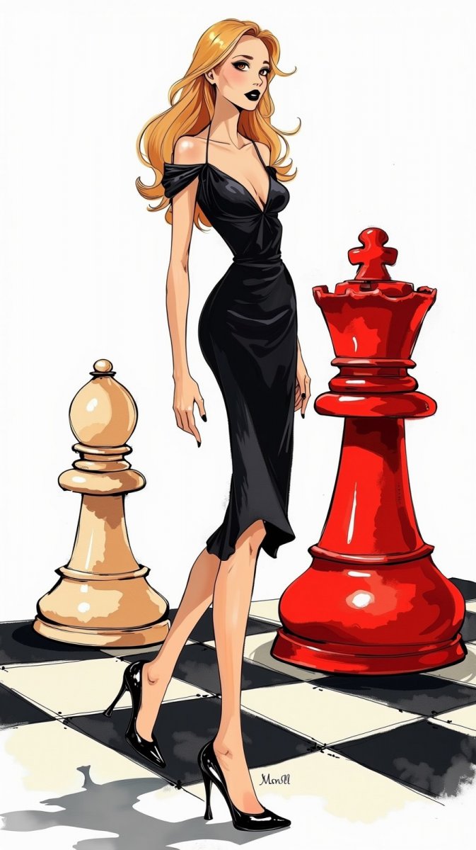 #3. fashion model, black dress, large chessboard with red chess piece, lips painted black, stiletto heel, elongated heel with small pointed tip, BG is white #role_red