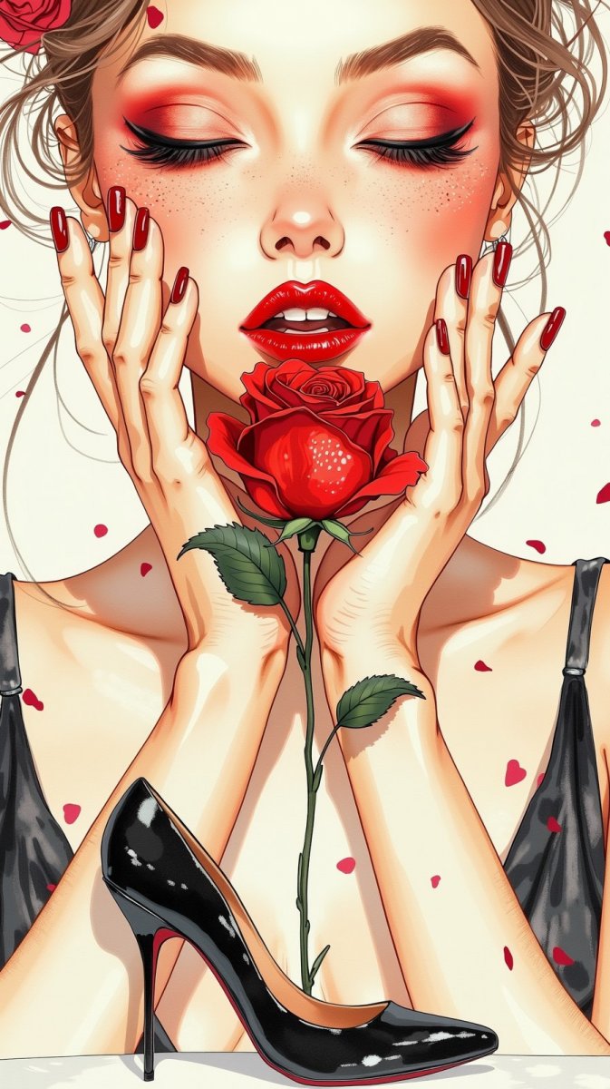 #5. close-up of lipstick with red strawberry on top, hands holding single rose, eyes closed, black dress, shiny material elongated heel with small pointed tip, creating romantic and elegant mood #role_red