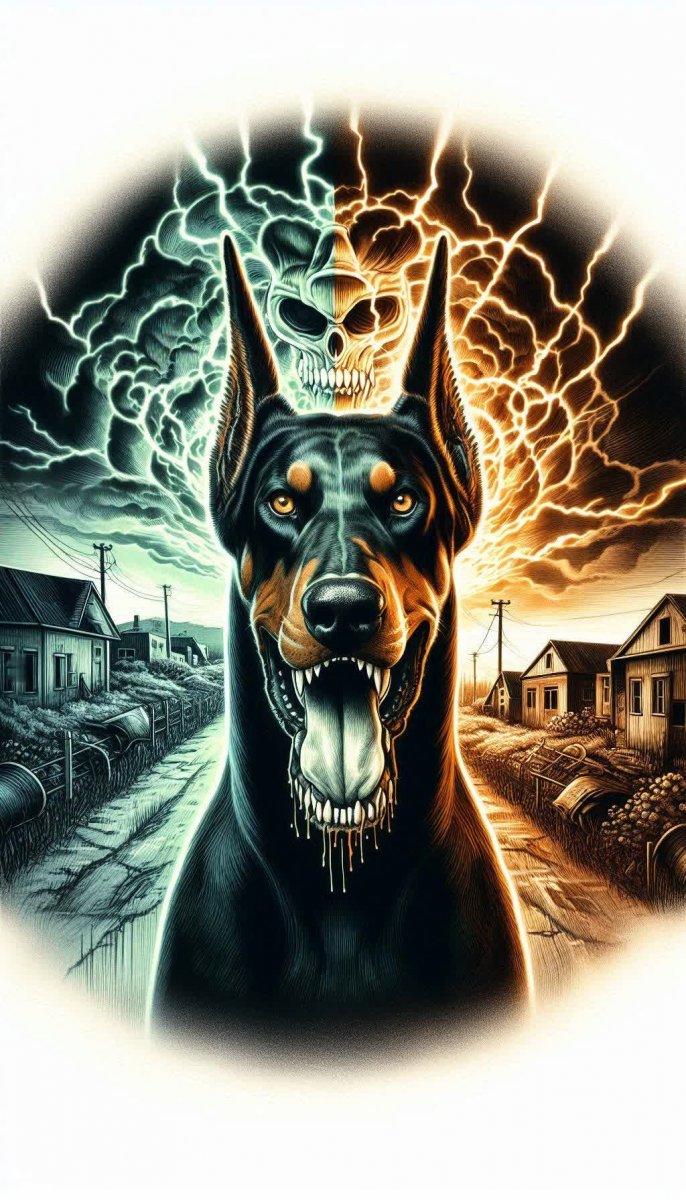 Portrait of a Doberman, outlined with toxic light, menacing guard gaze, fanged mouth, toxic glow, behind the back is desolation and post-apocalyptic view of an abandoned small town, the Doberman is the guardian of this town, dramatic lighting, intense detail, watercolor technique with ink and alcohol ink outline