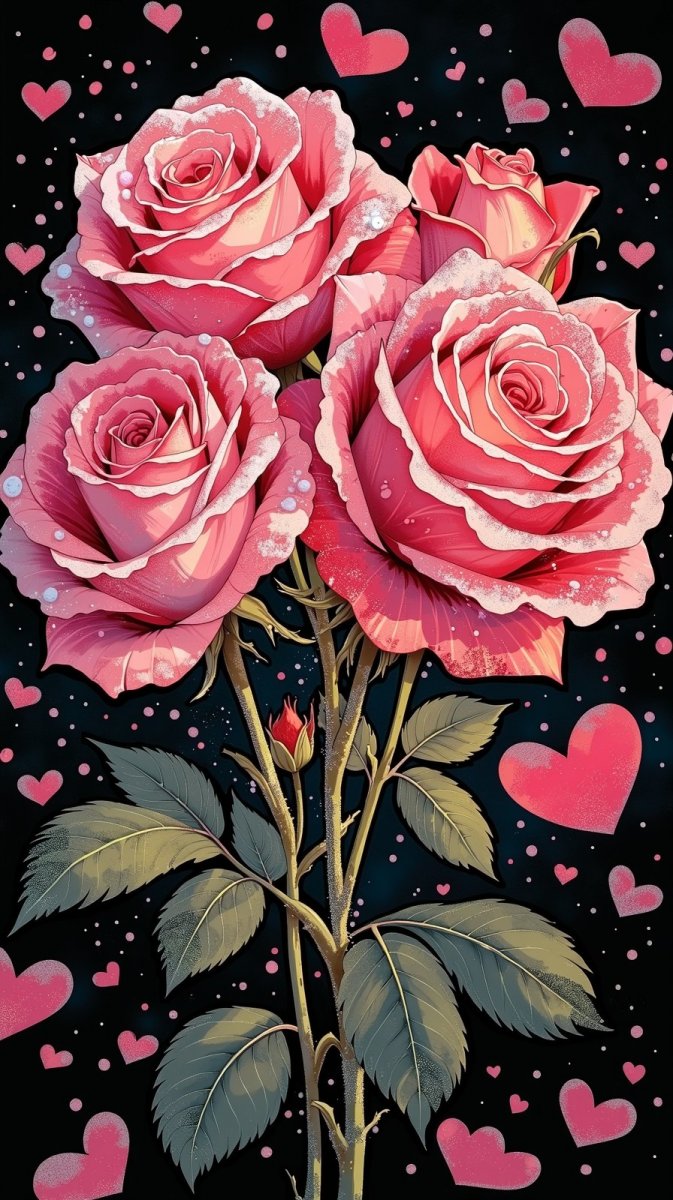 #3 promotional poster for valentine garavani brand, glossy finish, covered in sugar crystals, group of pink roses arranged in cluster, dark bg, smooth shiny skin, elegant and feminine #role_pink