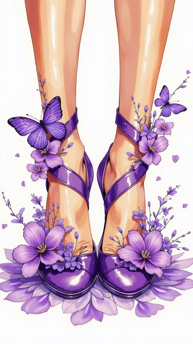 flux Фиолетовая элегантность: туфли на каблуке в окружении цветов и бабочек. Нейросеть Flux 1