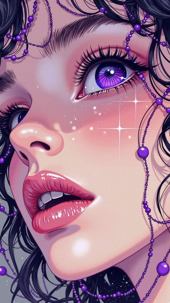 high-quality close-up of person's lips and eye, iris deep vibrant purple, full glossy lips with hint of pink blush, multiple strands of small round beads scattered throughout, dark curly hair, bg neutral grey, creating starry night sky #role_purple