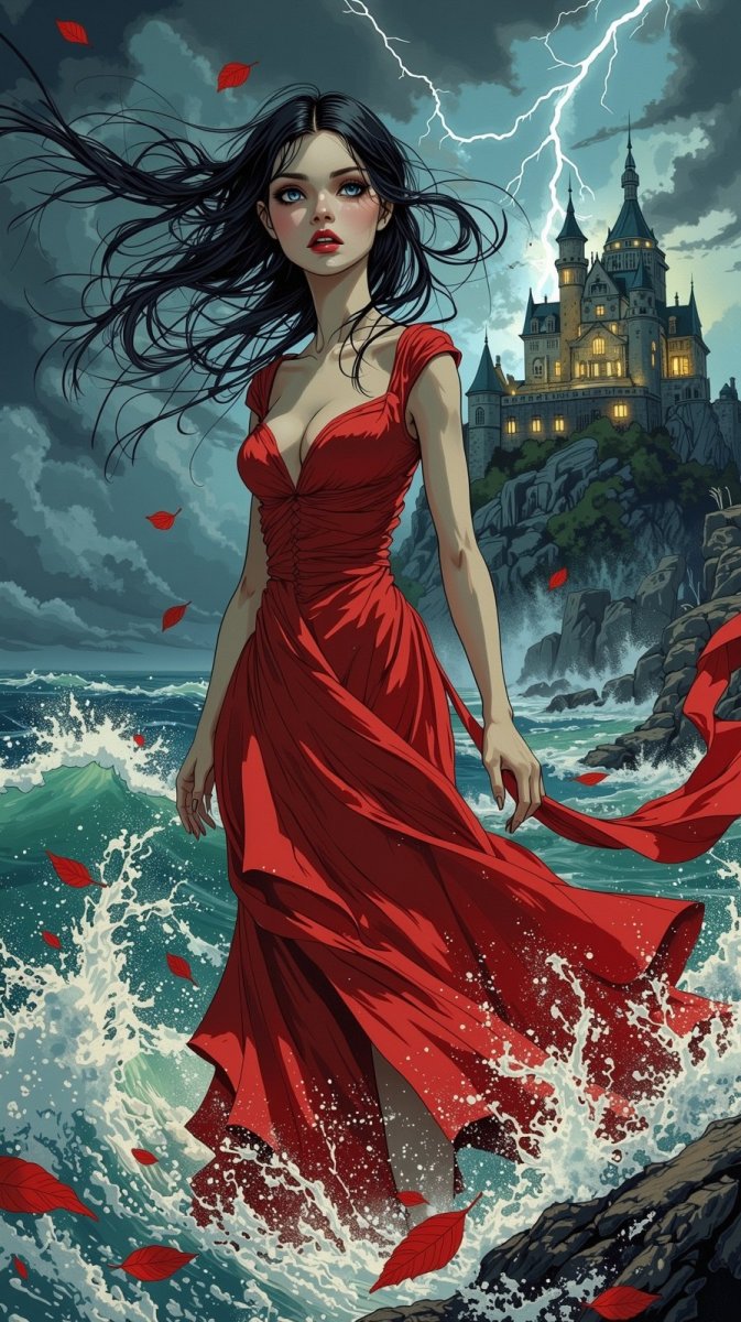 #3. вампирша на фоне бушующего шторма, платье из тончайшего шелка цвета крови, развевается на ветру, её глаза – два бездонных колодца, в которых отражается ярость стихии, вокруг неё - кружащиеся листья и брызги морской воды, на губах - кровавый оттенок поцелуя смерти, фон: полуразрушенный замок на скале, освещенный вспышками молний, light traces style, shutter speed 1/200, film grain, эффект размытия в движении, контрастность высокая. #role_vamp