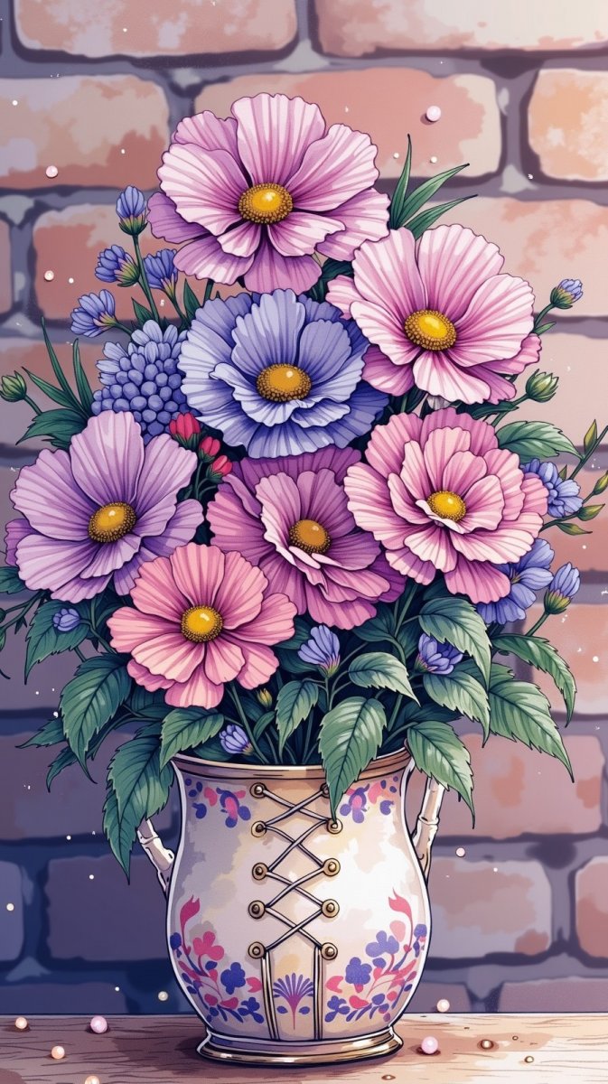 close-up of potted plant in coupe glass, flowers have yellow center, shimmering beads scattered throughout arrangement, lace-up closure, romantic and elegant mood, BG is blurred brick wall #role_purple