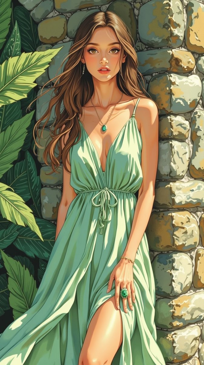 #4. close-up portrait of young woman standing in front of stone wall, wearing flowing dress with emerald ring, loose waves, overall effect tropical and lush feel #role_green