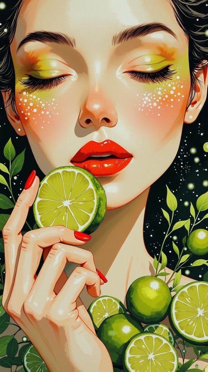 #2. portrait of woman's face holding slice of lime, lips painted bright red, eyes closed, sparkling appearance, reflecting surroundings on dark surface, elegant and sophisticated mood #role_green