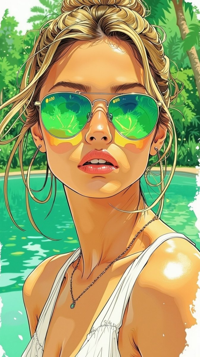 #1. hq portrait of a woman's face, wearing white sandals and large green sunglasses, serious expression, vibrant green color reflecting surroundings, BG is blurred outdoor setting. #role_green