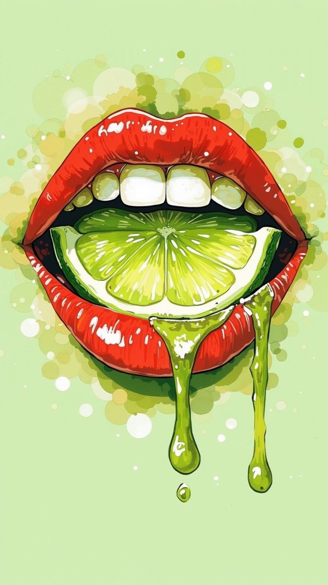 #5. hq slice of lime on lips revealing teeth, bright red lipstick, a playful and whimsical mood, sparkling appearance, overall effect tropical and lush feel. #role_green