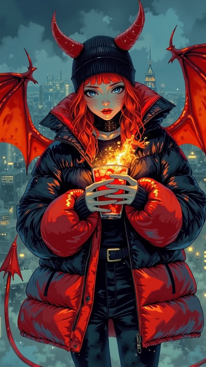 Загадочная и притягательная фотография, воплощающая образ современной вампирши. На снимке изображена девушка с огненно-рыжими волосами, выделяющимися на фоне ночного города, окутанного густым туманом. Её дерзкий стиль подчеркивает oversized пуховик насыщенных черных и красных оттенков, а изящный черный чокер добавляет образу загадочности. На голове у девушки – теплая шапка-бини с заостренными ушками, намекающими на её сверхъестественную природу. В руках она держит пылающий коктейль, его яркое свечение контрастирует с мрачной атмосферой вокруг. Фоном для этой эффектной сцены служит ночной городской пейзаж, погруженный в полумрак и туманную дымку. На фоне темных силуэтов зданий отчетливо выделяются демонические крылья, символизирующие мощь и связь с потусторонним миром. Профессиональная фотосъемка позволила передать мельчайшие детали – от текстуры пуховика до игривого мерцания коктейля, создавая ощущение реальности происходящего. Вся композиция пронизана атмосферой тайны и опасности, сочетая в себе элементы фэнтези и современной моды. Фотография рассказывает историю о сильной, независимой девушке, живущей вне времени и правил, но при этом остающейся неотъемлемой частью современного мира. Это не просто портрет – это окно в мир фантазий, где реальность переплетается с мистикой, а красота сочетается с мощью. Каждая деталь снимка тщательно продумана, чтобы создать незабываемое впечатление и вызвать бурю эмоций у зрителя