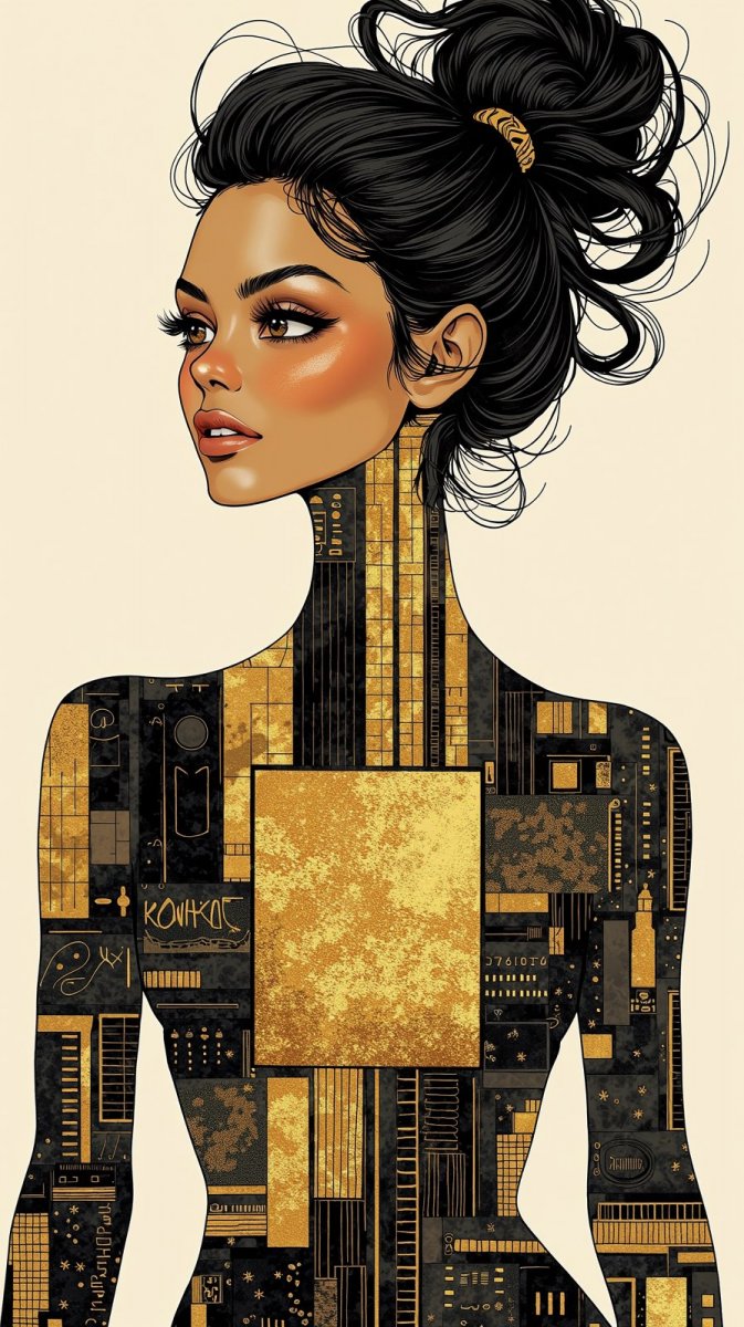 #2 digital art piece featuring portrait with a black and gold cityscape pattern, hair styled in sleek updo, large square mosaic effect in the center conveying power and strength, bold lines creating an edgy vibe #role_pinocollage