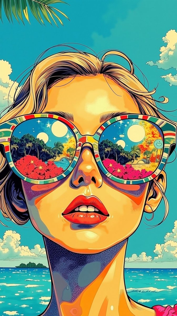 Яркая коллажная композиция с акцентом на крупные солнцезащитные очки необычного красочного дизайна. Небо над очками окрашено в небесно-бирюзовый цвет, создавая ощущение простора и легкости. Разнообразие текстур добавляет изображению глубины и объемности, а смелые линии подчеркивают динамику и энергию кадра. Вся картина излучает спокойствие и безмятежность, приглашая зрителя погрузиться в атмосферу расслабленности и умиротворения. Это визуальное исследование сочетания цвета формы и текстуры, передающее чувство гармонии и внутреннего равновесия. Композиция использует приемы пиноколлажа для создания многослойного эффекта, где каждый элемент взаимодействует с другими, формируя единое целое. Игра света и тени усиливает ощущение реализма и глубины пространства. Этот образ – идеальное воплощение летнего настроения и позитива, сочетающее в себе элементы моды искусства и природы. Картина создает впечатление моментальной зарисовки, словно пойманной из потока жизни