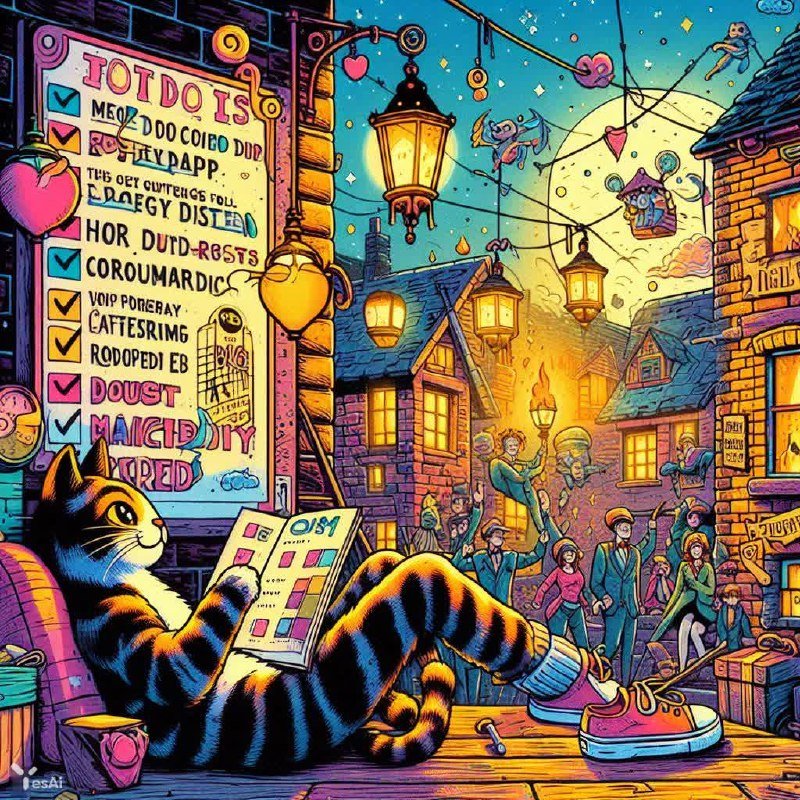 Уютное воскресное собрание в атмосфере творчества и вдохновения. На фоне сюрреалистичного пейзажа, где сломанные фонари освещают постеры с упражнениями для дикции, располагается расслабленный котик – хранитель списка важных дел на выходные. Его спокойствие контрастирует с волнением группы людей, стоящих за его спиной и держащихся за руки, символизируя единение и поддержку в стремлении к самосовершенствованию. Картина пронизана фантастическим настроением, словно выхваченная из страниц комикса, где реальность переплетается с мечтами и надеждами на продуктивный отдых и раскрытие творческого потенциала. Это момент гармонии между внутренним миром и внешними обстоятельствами, приглашающий к размышлениям о ценности каждого мгновения и важности окружения в достижении целей. Наслаждение простыми радостями жизни в компании близких людей – вот что символизирует это необычное собрание под неусыпным взглядом кота-хранителя выходных. Это не просто вечер, а настоящий ритуал перезагрузки и подготовки к новым свершениям