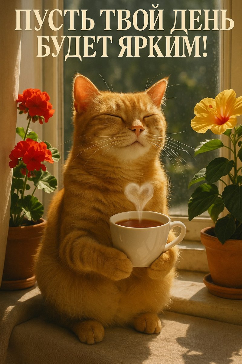 фотореалистичное изображение веселого кота, сидящего на уютном подоконнике, окруженного цветущими растениями, кот держит в лапах чашку чая с паром в виде сердечка, солнечные лучи освещают его мордочку, текст на русском языке "Пусть твой день будет ярким!'"