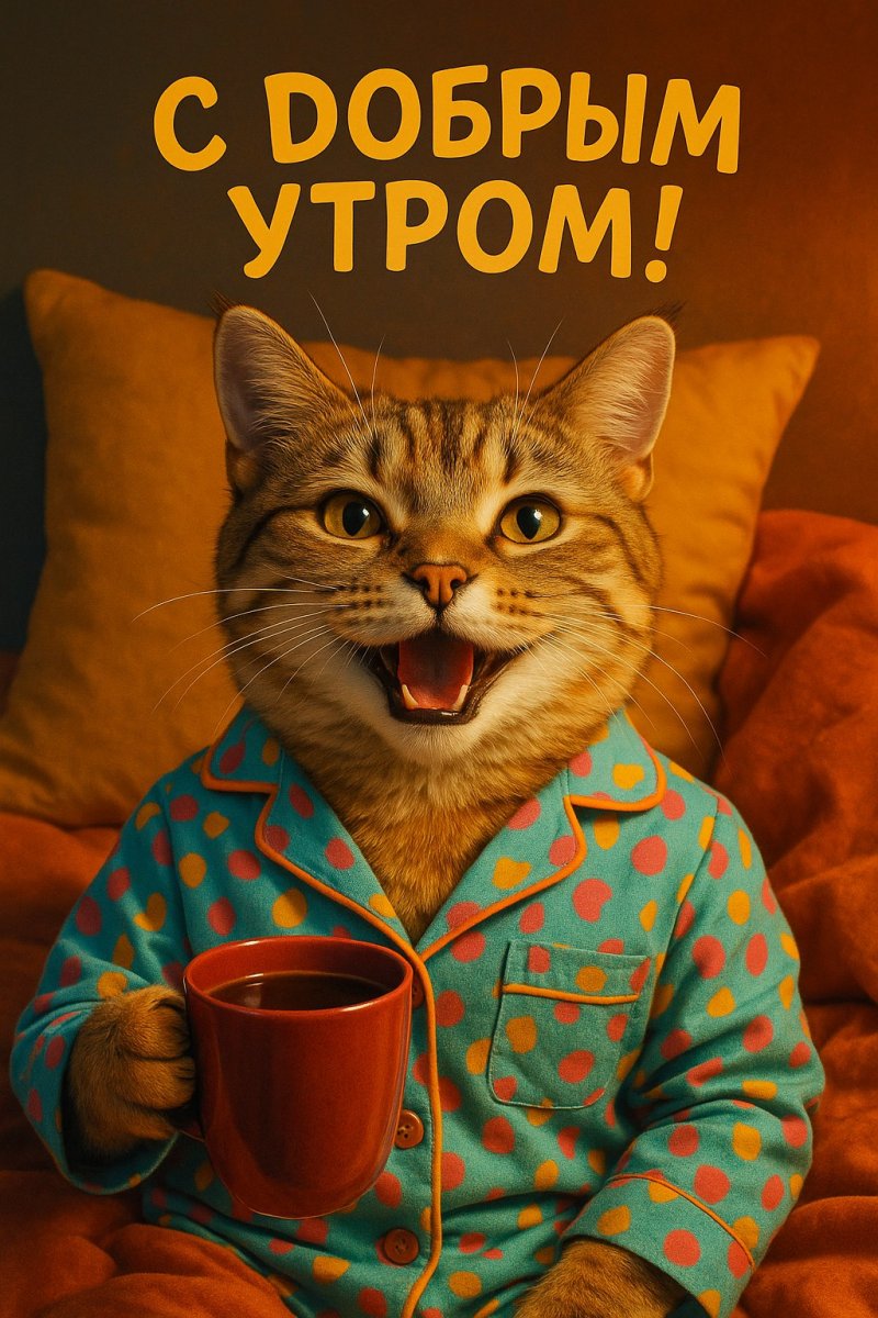 веселый кот, одетый в пижаму, держит чашку с кофе в лапе, на фоне подушка и одеяло, яркие тона, атмосферное освещение, текст "С добрым утром!" в игривом шрифте.