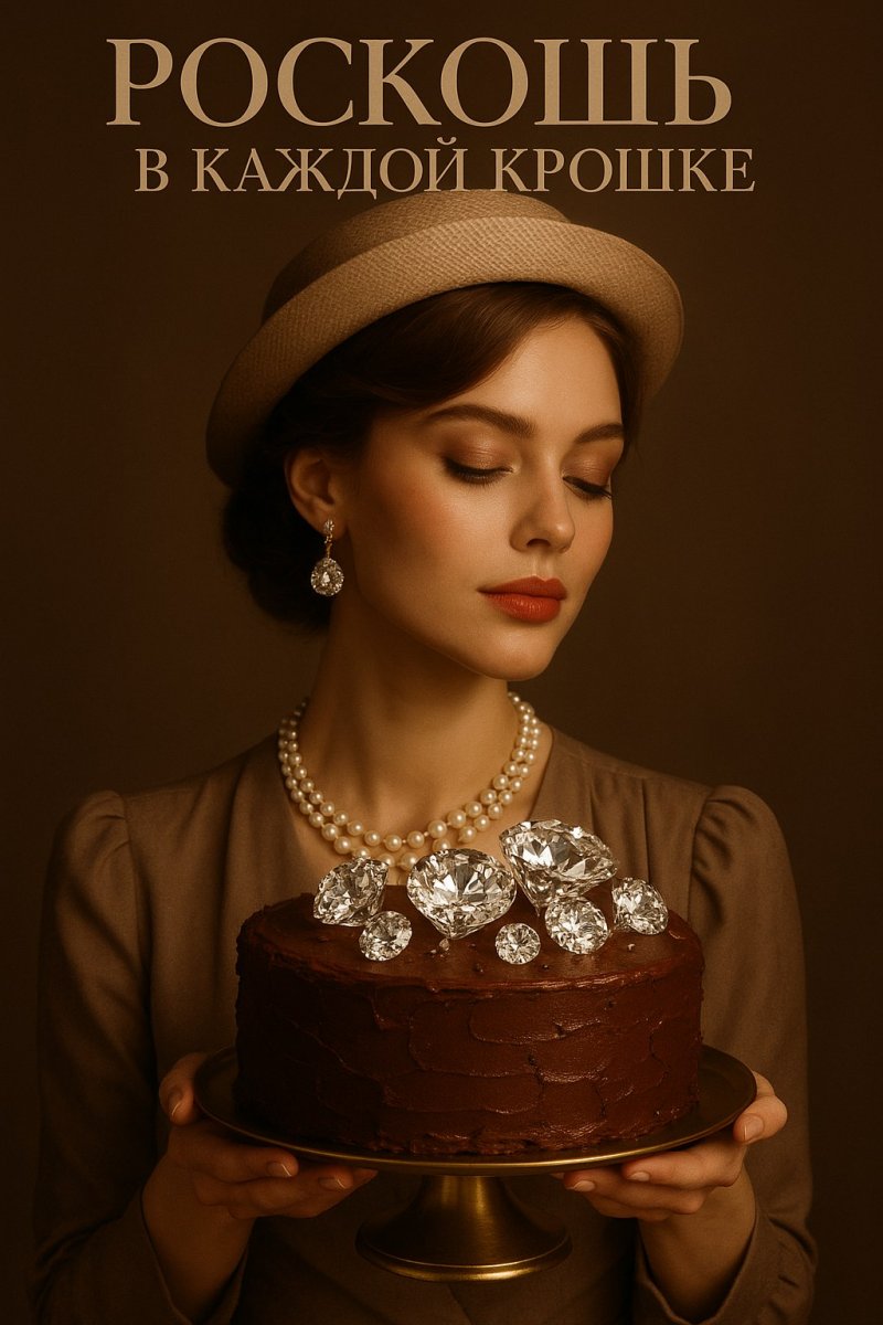 A sophisticated lady holds a luxurious chocolate cake adorned with sparkling diamonds. Soft golden light illuminates her face, enhancing her elegance as she wears delicate gloves and a vintage hat. The phrase "Роскошь в каждой крошке" is subtly integrated into the composition, symbolizing the theme of indulgence.