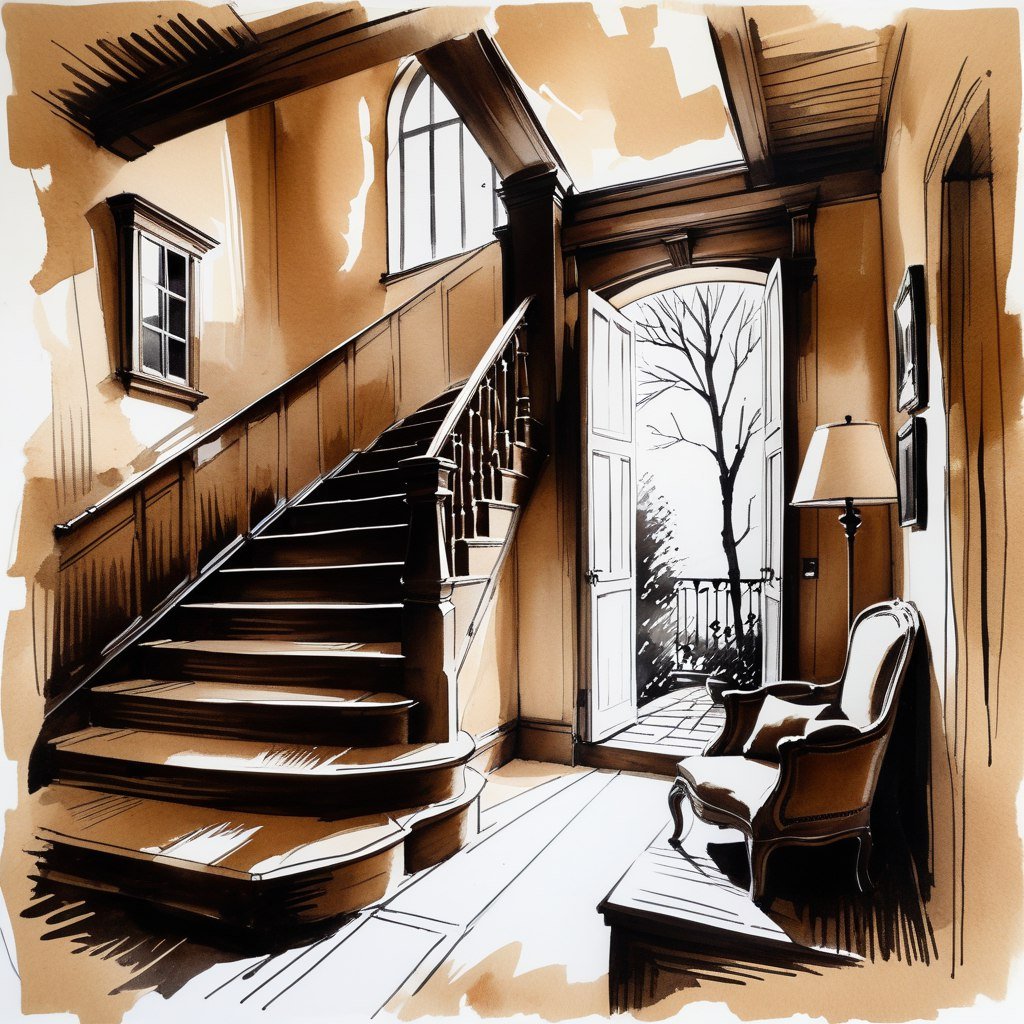 Изящный эскиз, выполненный на фоне состаренной коричневой крафтовой бумаги, пленяет своей простотой и глубиной. Аккуратные линии чернильной ручки создают основу для изображения, а деликатные мазки белой кистью добавляют легкости и воздушности, придавая работе эффект sfumato – мягкого перехода тонов, характерного для живописи эпохи Возрождения. В центре композиции запечатлен фрагмент дома с витиеватой лестницей, гармонично вписанный в пейзаж, где возвышается одинокое дерево. Тщательная детализация рисунка подчеркивает мастерство художника и его внимание к мельчайшим нюансам. Грубые текстуры бумаги и намеренные дефекты придают работе особый шарм, создавая ощущение подлинности и времени. Этот эскиз – не просто изображение, а целая история, рассказанная языком линий и теней, воплощение гармонии между природой и человеческим жильем, наполненное атмосферой уюта и тепла, несмотря на легкую потертость и винтажный оттенок. Кажется, будто сквозь слои времени можно различить отголоски прошлого, ощутить дуновение ветра и услышать шепот листвы. Это произведение искусства способно вызвать самые теплые воспоминания и подарить чувство умиротворения, напоминая о красоте простых вещей и важности момента