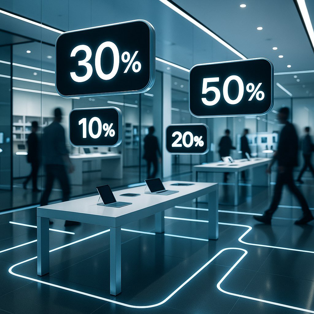 Современный магазин электроники и цифровые скидки в стиле Apple TV - Картинка из нейросети Sora Image