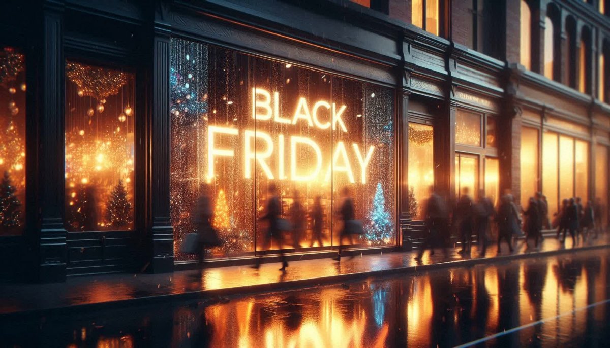 Gleaming glass storefront reflecting a giant illuminated “Black Friday” banner, shimmering raindrops on window, cozy warm lights inside, softly blurred reflections of rushing shoppers, golden hour lighting, subtle rainbow flares, intricate window decal textures, high-definition realism, in the style of cinematic photography, present time, cgi, 1024K