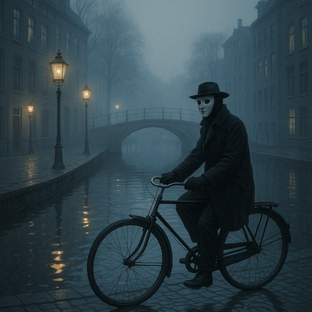 A masked stranger rides a vintage bicycle along misty canals, streetlights cast rippling reflections, empty bridges arch over silent water, distant silhouettes in upper windows, muted blue-grey palette, delicate ripples on water, gentle morning fog, past time, in the style of classic European photography, cgi, 1024K