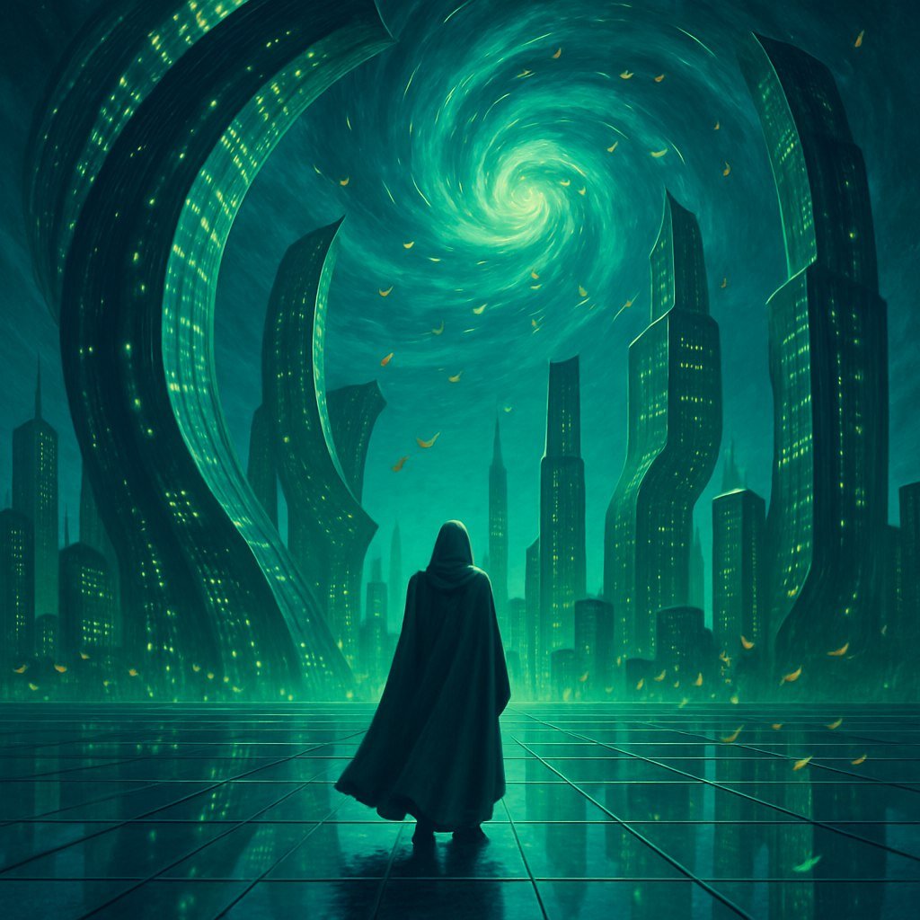 A lone figure draped in a flowing cloak stands at the edge of a vast glass plaza, glowing city towers curve in impossible directions, swirling vortex of windblown leaves, scattered shards of light, saturated emerald and indigo, stylized elongated shadows, present time, in the style of surrealist digital art, cgi, 1024K