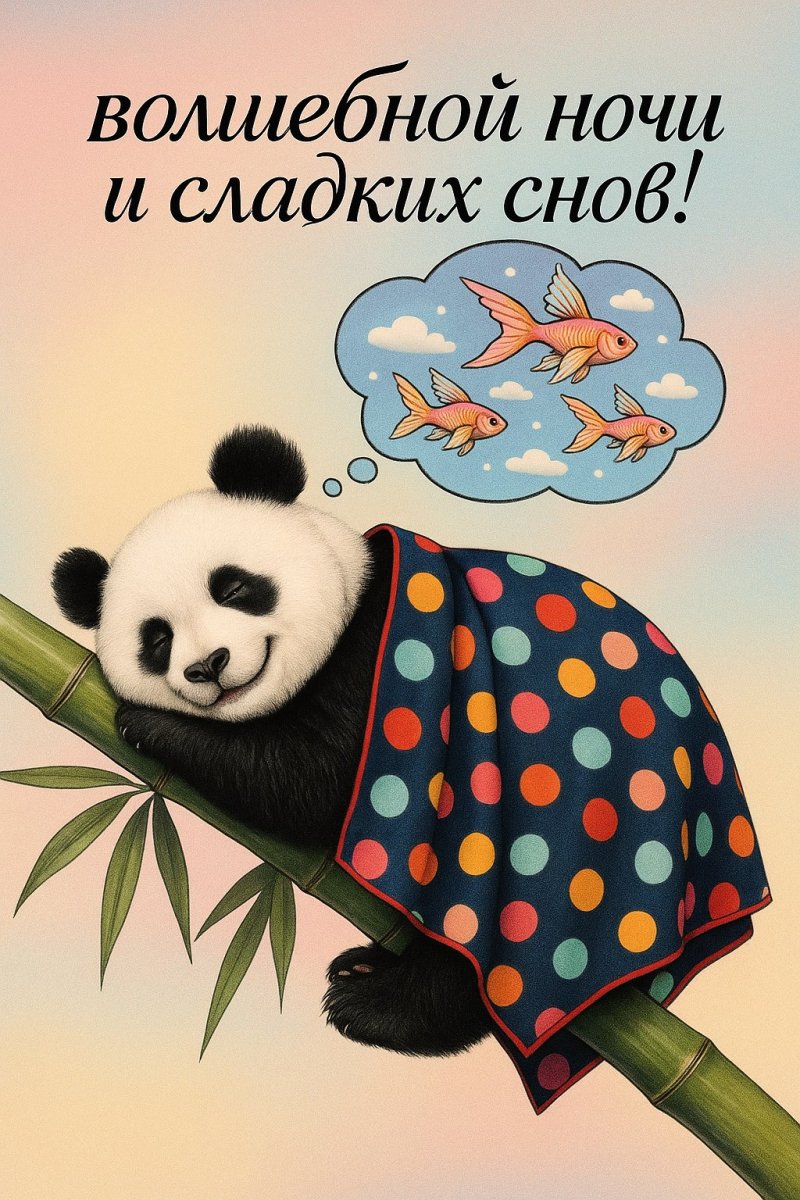 Милая панда сладко спит на бамбуковой ветке укрытая ярким пледом в горошек ее сон полон волшебства она видит летающих рыб на фоне нежного пастельного фона это картина спокойствия и безмятежности наполненная детской наивностью и сказочными образами изображение излучает позитив и тепло создавая ощущение уюта и защищенности словно сама ночь шепчет добрые пожелания и оберегает от кошмаров панда кажется такой беззаботной и счастливой что невольно хочется присоединиться к ее сну и окунуться в мир грез где все мечты становятся реальностью яркие цвета пледа и мягкие тона фона гармонично сочетаются друг с другом создавая визуальный баланс который успокаивает и расслабляет эта иллюстрация идеально подойдет для оформления детских комнат открыток или любых других проектов которые нуждаются в дозе позитива и сказки она станет прекрасным напоминанием о том что даже самые обычные вещи могут быть волшебными если смотреть на них с любовью и воображением слова Волшебной ночи и сладких снов! написанные игривым шрифтом завершают эту очаровательную картину добавляя ей еще больше тепла и душевности это настоящий гимн спокойствию и радости который подарит улыбку каждому кто на него взглянет