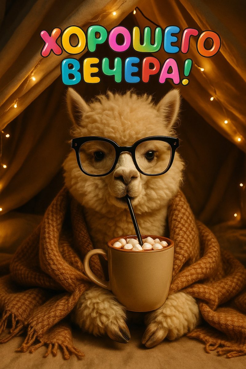 A fluffy alpaca wearing oversized glasses, sipping on hot cocoa with marshmallows, nestled in a cozy blanket fort, surrounded by fairy lights, "Хорошего вечера!" written in vibrant bubbles.