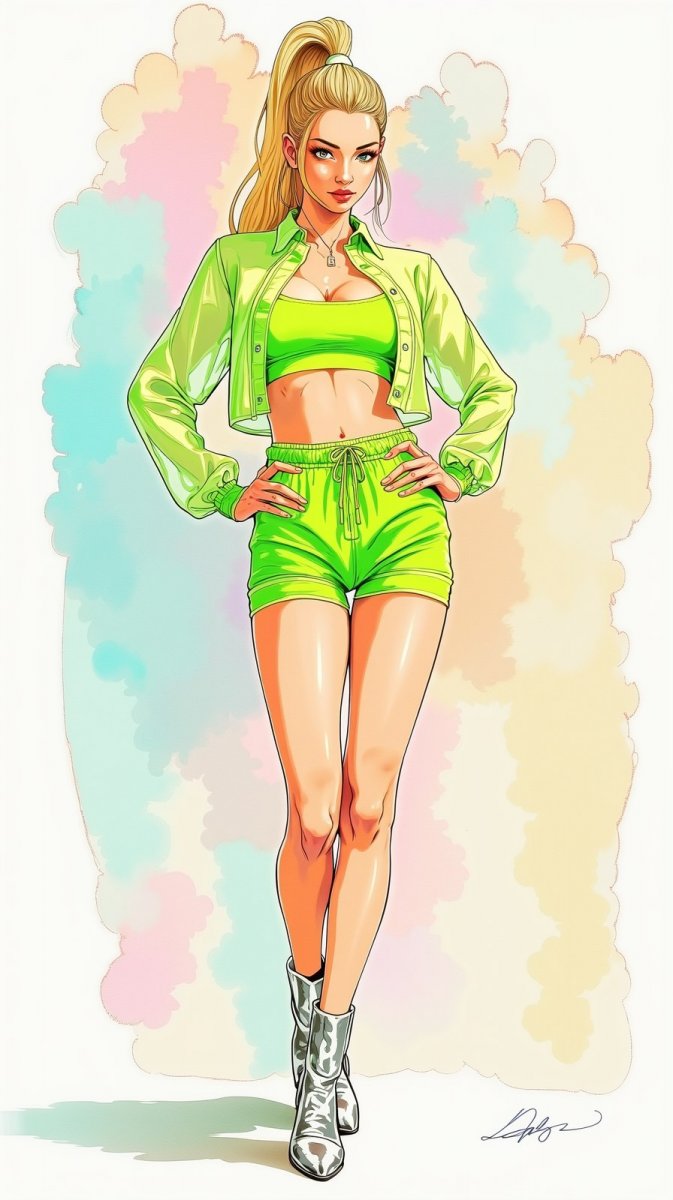 #2. illustration, ink drawing, standing against pastel backdrop in neon green crop top with long sheer sleeves, matching high-waisted shorts with drawstring, wearing reflective silver ankle boots, long blonde hair in high ponytail, confident pose with hands on hips, edgy atmosphere. #role_fashion_model
