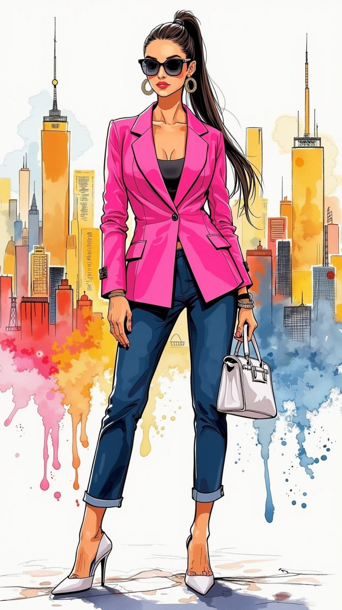 #4. illustration, ink drawing, posing in neon pink tailored blazer with contrasting navy pants, fashionable white heeled mules, long dark hair in sleek ponytail, vibrant city skyline in the background, exuding modern sophistication and edgy flair. #role_fashion_model