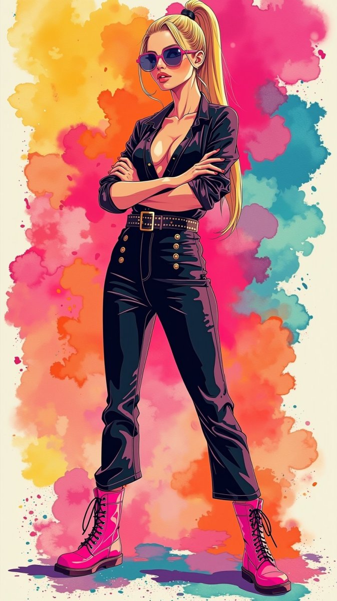 Яркая иллюстрация модной модели в стильном черном комбинезоне с глубоким вырезом и высокой талией. Образ дополняют дерзкие неоново-розовые ботинки на платформе и объемные солнцезащитные очки, создавая запоминающийся акцент. Длинные светлые волосы собраны в гладкий хвост, подчеркивающий уверенность и элегантность фигуры. Модель позирует скрещенными руками на фоне насыщенного красочного фона, излучая энергию и харизму. Изображение передает атмосферу современной моды и смелых экспериментов с цветом и силуэтами. Это визуальный манифест силы и уверенности в себе, отраженный в деталях одежды и выразительной позе. Картина идеально подходит для рекламных кампаний или публикаций в глянцевых журналах, демонстрируя актуальные тренды и вдохновляя на создание собственных уникальных образов. Неоновые оттенки добавляют динамики и привлекательности, делая акцент на яркой индивидуальности модели и ее безупречном вкусе. Комбинация классического черного комбинезона и смелых неоновых аксессуаров создает эффектный контраст, подчеркивающий современность и актуальность представленного стиля