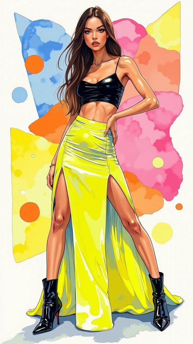 #2 ink drawing, neon colors, wearing bright yellow holographic skirt with high slit and black crop top, high-heeled ankle boots, long brunette hair cascading down shoulders, posing with one hand on hip against abstract shapes. #role_fashion_model