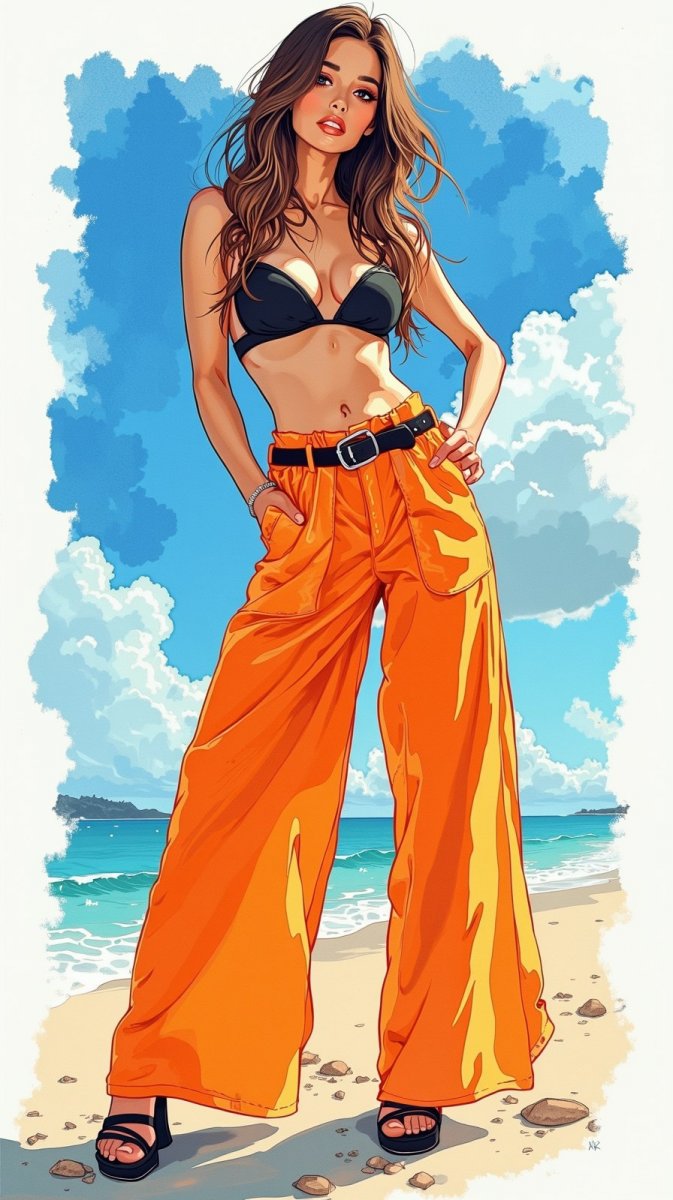 #4. illustration, ink drawing, posing against blue backdrop, wearing black bikini top and neon orange wide-legged pants, chunky black heels, long brown hair styled in loose waves, stylish and edgy look. #role_fashion_model