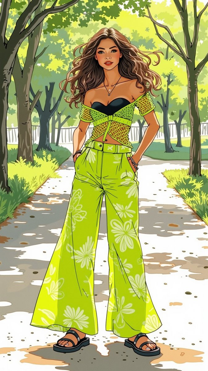 #5. illustration, ink drawing, dressed in a bright green mesh top layered over a black bandeau, wide-leg neon patterned pants, platform sandals, playful curly hair cascading down, smiling energetic pose in a sunlit park, vibrant and lively feel. #role_fashion_model