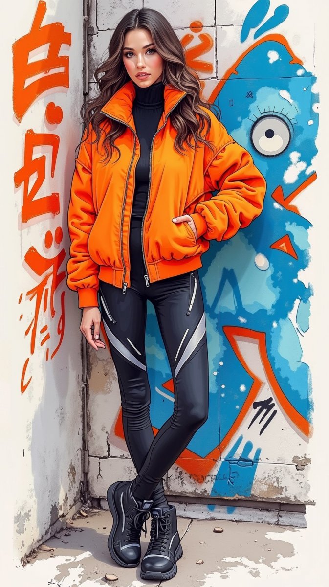 #1. illustration, ink drawing, posing in neon orange oversized bomber jacket with high collar, sleek black leggings with reflective accents, high-top black sneakers, hair styled in loose curls, standing with one hand on hip against a graffiti wall background, modern and urban vibe. #role_fashion_model
