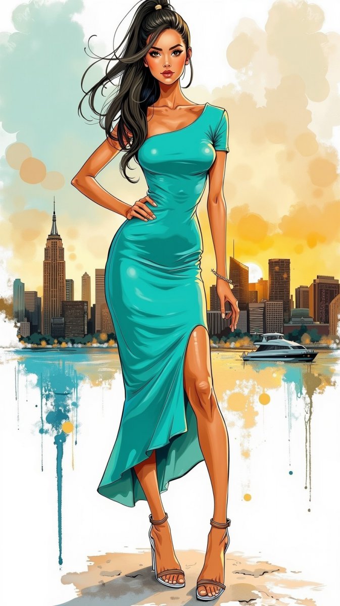 #2. illustration, ink drawing, wearing bright teal fitted dress with asymmetrical hemline, clear block heels, long dark hair styled in a sleek ponytail, posing against a city skyline at dusk, confident and chic demeanor. #role_fashion_model