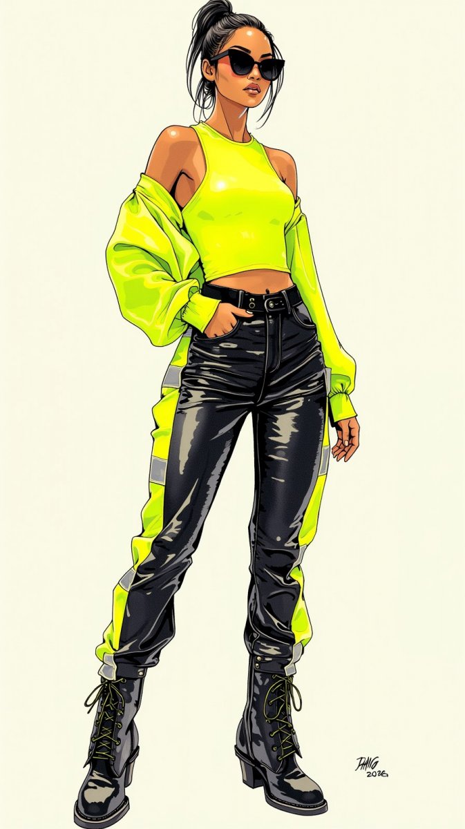 Яркая и динамичная иллюстрация в технике туши демонстрирует современную модную модель. В центре внимания – дерзкий образ, сочетающий неоновые акценты с классической элегантностью. Модель эффектно позирует, облаченная в неоново-лимонный топ без рукавов, подчеркивающий ее спортивную фигуру. Костюм дополнен черным нарядом с длинными прозрачными рукавами и высокими отражающими брюками, создающими футуристичный силуэт. Завершают образ массивные черные ботинки в стиле милитари и собранный в высокий хвост пучок волос. На лице модели – стильные солнцезащитные очки, а общий ансамбль подчеркнут использованием блестящих материалов, добавляющих образу яркость и динамику. Композиция излучает уверенность, энергию и современный взгляд на моду, представляя собой визуально привлекательную интерпретацию современной модной фотографии. Использование неоновых цветов придает изображению особую выразительность и делает его запоминающимся, а детализированная прорисовка подчеркивает мастерство художника. Этот образ идеально подходит для демонстрации последних тенденций в уличной моде и отражает дух смелости и индивидуальности