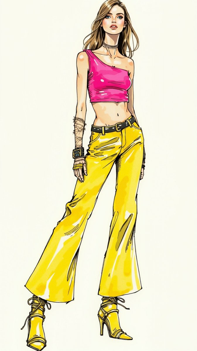 #5 illustration ink drawing fashion model neon colors wearing bright pink crop top, wide-legged pants, shiny metallic material, yellow high-heeled boots with straps and buckles, looking up at camera with confident expression, edgy mood #role_fashion_model
