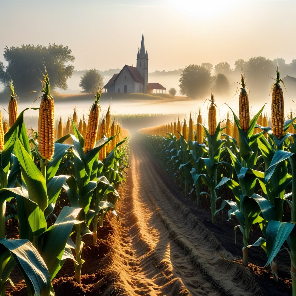 Изысканная акварельная пастораль, сотканная из нежности и света. Перед зрителем раскинулось золотистое море кукурузных початков на залитом солнцем поле, уходящее вдаль к едва различимой деревушке, окутанной легкой дымкой. Вся сцена пронизана атмосферой волшебства и безмятежности – ощущение тихой радости и умиротворения наполняет пространство вокруг. Детальная работа выполнена в технике филигранной графики чернилами с поразительной точностью, подчеркивающей каждую прожилку листа, каждый отблеск солнца на песчинках. Мягкое освещение создает ощущение воздушной перспективы и придает изображению особую глубину. Нежный песочный туман добавляет загадочности и усиливает впечатление нереальности происходящего. Высококачественный Octane render обеспечивает невероятную реалистичность текстур, позволяя ощутить шероховатость початков кукурузы и тепло солнечных лучей. Это не просто пейзаж – это поэтическое видение природы, запечатленное в деталях с любовью и мастерством, вызывающее чувство покоя и восхищения красотой окружающего мира. Картина передает тончайшие нюансы света и тени, создавая ощущение почти осязаемой реальности. Это произведение искусства, которое хочется рассматривать бесконечно, открывая для себя новые детали и оттенки настроения