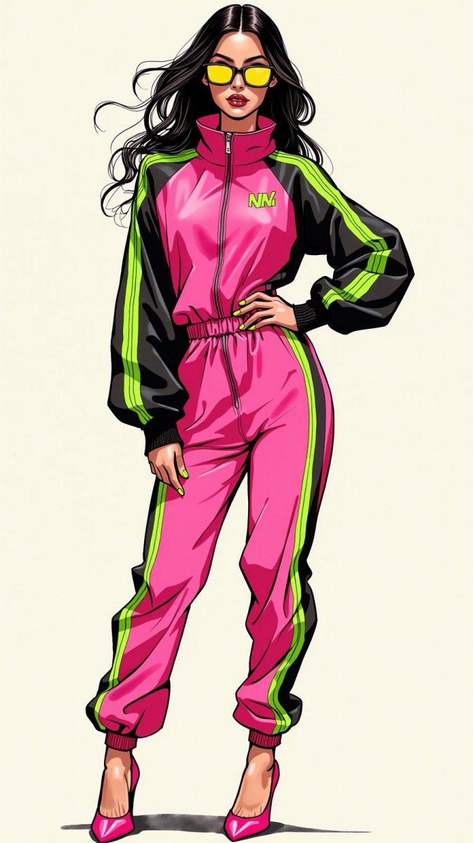 #5 ink drawing, posing in full body shot, wearing pink and black tracksuit with neon green stripes, high neckline, shiny material, long dark hair styled in loose waves, one hand on hip, yellow sunglasses, overall style modern and edgy. #role_fashion_model