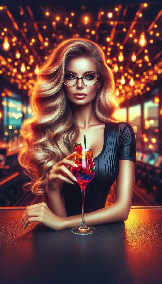 Элегантная красота в свете ночного города. Завораживающая фотография запечатлевает момент расслабленности и стиля: длинные светлые волосы контрастируют с лаконичной черной майкой, а изысканные очки в золотой оправе подчеркивают утонченный вкус. Женщина, словно сошедшая с глянцевой обложки, уверенно сидит на барной стойке, держа в руках бокал с освежающим коктейлем. Оранжевые огни вечернего города создают атмосферу тепла и загадочности, добавляя снимку игривости и динамики. Кажется, будто она – главная героиня музыкального клипа или кадра из стильного кинофильма. Это не просто фотография - это история, рассказанная взглядом и жестом, отражающая уверенность в себе и наслаждение моментом. Идеально подойдет для обложки музыкального альбома, рекламной кампании напитка или как часть визуальной концепции современного бренда, стремящегося к элегантности и чувственности. В этой фотографии сочетаются эстетика высокой моды и непринужденная атмосфера ночной жизни, создавая неповторимый образ женщины, которая знает себе цену и умеет наслаждаться жизнью во всей ее полноте. Этот кадр вызывает желание окунуться в мир музыки, танцев и ярких впечатлений, где каждая деталь продумана до мелочей, а главное действующее лицо излучает харизму и привлекательность