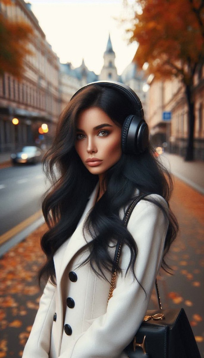 Осенняя меланхолия урбанистического портрета. Молодая женщина в белой кожаной куртке и черных брюках застыла на фоне увядающего города, погруженная в мир музыки. Её длинные чёрные волосы контрастируют с бледным оттенком кожи, а серьёзное выражение лица говорит о глубоких размышлениях. Большие чёрные наушники – символ отстранённости и концентрации на внутреннем мире, где звучит ритм города, сливаясь с личными переживаниями. Разбросанные листья под ногами напоминают о быстротечности времени и неизбежности перемен. Атмосфера задумчивости и стильной элегантности пронизывает каждый элемент кадра, создавая ощущение утончённой грусти и внутренней силы. Фотография передает настроение одиночества в толпе, поиск гармонии в хаосе городского пейзажа. Это не просто портрет, а визуальная метафора о поиске себя, о принятии неизбежности осени как времени перемен и новых начинаний, когда музыка становится лучшим спутником в этом путешествии. Идеальное сочетание моды, настроения и атмосферы, передающее дух современной городской жизни через призму индивидуальности и внутренней свободы. Камера запечатлела момент истины, когда внешняя суета отступает перед глубиной чувств и мыслей