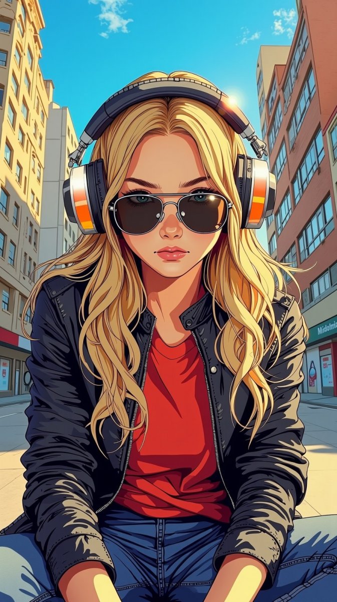Современный городской портрет девушки в стильной одежде и наушниках. Молодая женщина с длинными светлыми волосами и солнцезащитными очками, облаченная в черную кожаную куртку и красную футболку, задумчиво сидит на городском тротуаре. На ней большие наушники, подчеркивающие ее погруженность во внутренний мир или любимую музыку. За спиной возвышаются небоскребы, а над головой простирается ярко-голубое небо, создавая ощущение простора и свободы. Выражение лица серьезное и сосредоточенное, что добавляет образу глубины и загадочности. Фотография выполнена профессионально, с акцентом на детали и игру света. Вся композиция пронизана атмосферой футуризма и элегантности – это не просто портрет, а воплощение современного стиля жизни, ритма большого города и увлечения музыкой. Кажется, будто она ждет чего-то важного или готова к новым приключениям в этом динамичном и захватывающем мире. Это визуальный гимн энергии молодости, уверенности и любви к современной культуре. Изображение прекрасно подойдет для обложки музыкального альбома или рекламной кампании, ориентированной на молодежную аудиторию