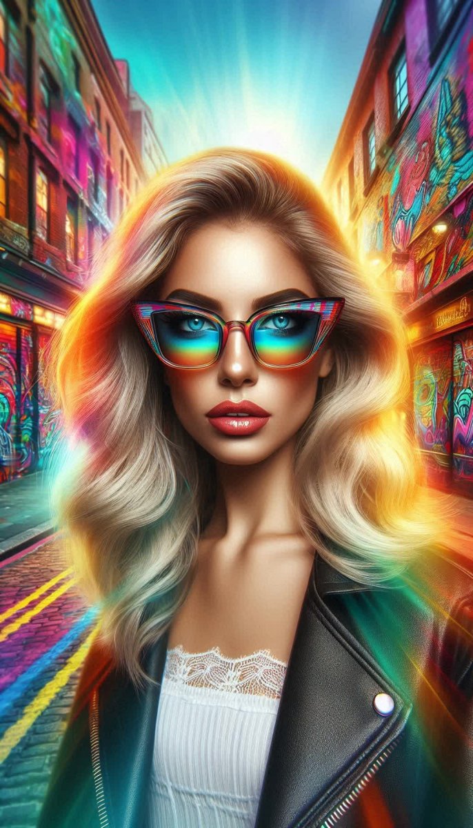 #3. профессиональное фото молодой женщины с короткими светлыми волосами и ярком макияже, с большими солнечными очками, стоящей на улице с граффити на стенах, с уверенным выражением лица, фон с яркими цветами и динамичными линиями, настроение креативное и энергичное #role_music