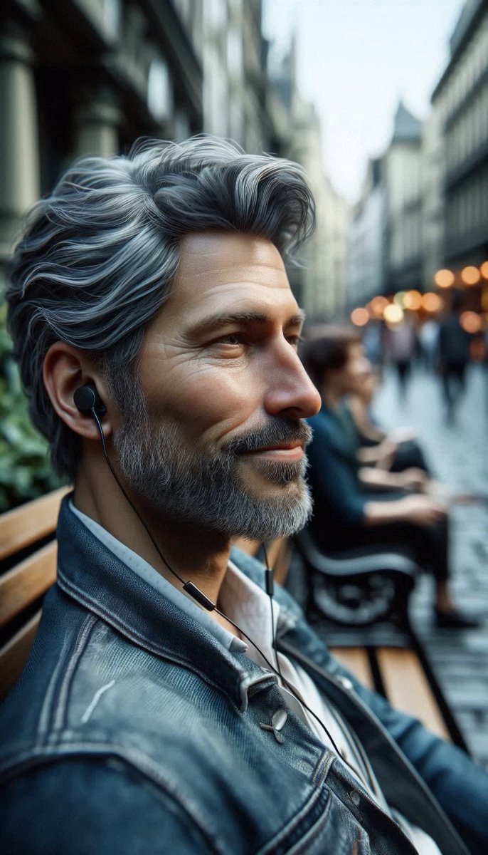 2. Portrait of a middle-aged man with salt-and-pepper hair, wearing sleek black earbuds and a denim jacket, seated on a city bench, lost in his music with closed eyes and a slight smile, background features a blurred city street bustling with people, conveying serenity in chaos.