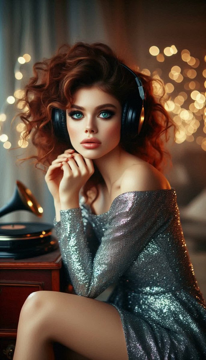Загадочная девушка с пронзительными изумрудными глазами и огненно-рыжими кудрями погружена в мир музыки. На ней просторный черный наушник, а ее образ дополняет мерцающее серебряное платье. Она удобно расположилась на старинной грампластинке, словно сошедшей со страниц истории, и кажется полностью поглощена размышлениями. Размытый фон с мириадами сверкающих огоньков создает неземную и мечтательную атмосферу, окутывая ее аурой тайны. Кажется, что музыка – это портал в другой мир, где реальность растворяется в волшебстве звуков и образов. Ее взгляд направлен вдаль, словно она видит мелодии, слышит шепот прошлого и чувствует вибрации будущего. Она – воплощение вдохновения, загадки и безграничной фантазии. Этот кадр передает ощущение умиротворения и глубокой внутренней гармонии, где время замедляется, а душа свободно парит в облаках мечтаний. Изящный ретро-стиль сочетается с современным пониманием красоты, создавая уникальный образ, который завораживает и вдохновляет. Она словно живое воплощение музыкальной легенды, застывшей во времени