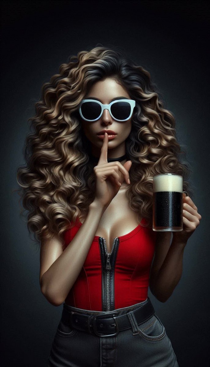 #5. профессиональная фотография молодой женщины в красной майке, белых брюках и чёрных ботинках, длинные кудрявые волосы, большие белые солнцезащитные очки с черной оправой, держащая кружку темного пива в правой руке, делает жест «молчания» пальцем на губах, фон – темно-серый, атмосфера таинственная и мрачная #role_music