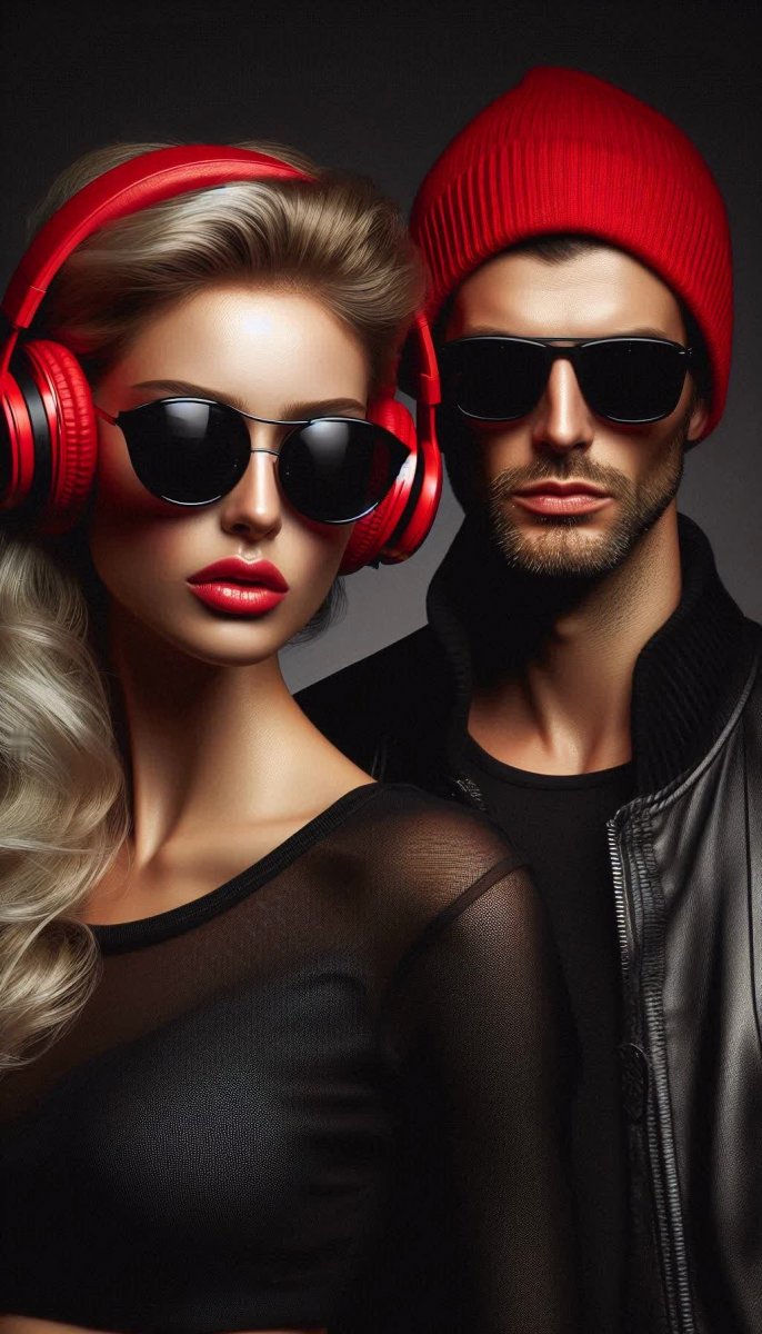 Стильная пара запечатлена в профессиональной фотографии, излучающей уверенность и скрытую энергию. Женщина с яркими красными наушниками и солнечными очками, ее светлые волосы контрастируют с лаконичной черной майкой, создает образ современной городской модницы. Рядом – мужчина в дерзкой красной шапке-бини и стильной кожаной куртке, его взгляд, прямой и серьезный, добавляет драматизма кадру. Фон в темно-серых тонах подчеркивает контраст между персонажами и создает атмосферу загадочности и некоторой напряженности. Вся композиция пронизана духом бунтарства и дерзости, намекая на принадлежность к музыкальной сфере или творческому миру. Эта фотография – не просто портрет, а визуальное воплощение силы, стиля и уверенности в себе, идеально передающее настроение современной музыки и молодежной культуры. Качество снимка говорит о профессионализме фотографа, сумевшего запечатлеть не только внешнюю привлекательность героев, но и их внутренний мир, полный энергии и амбиций. Это изображение вызывает желание узнать больше об этих людях и их истории, погружаясь в атмосферу дерзкого стиля и непоколебимой уверенности