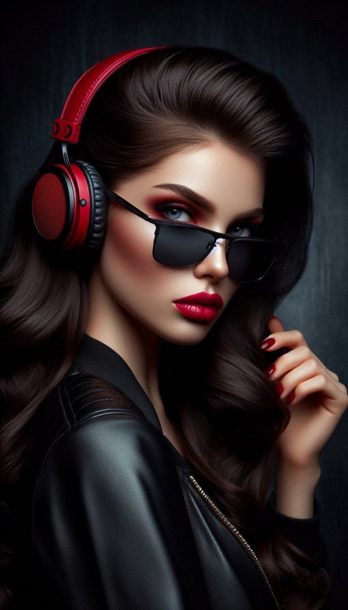 #1. профессиональная фотография молодой женщины с длинными темными волосами и красной помадой, надевшей черную кожаную куртку, большие красные наушники со стильным дизайном и красным амбушюром, а также черные солнцезащитные очки, волосы уложены в свободные волны, серьезное выражение лица, смотрящее в сторону, фон темный, стиль - футуристический и дерзкий #role_music