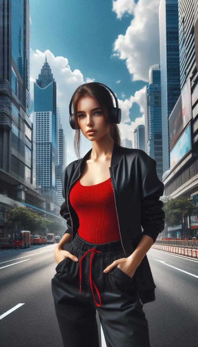 #5. профессиональная фотография молодой женщины в центре городской улицы с высокими зданиями по обеим сторонам, в черной кожаной куртке, красной майке-топе, черных штанах, красных кроссовках, наушниках на голове, смотрящей в сторону со серьезным выражением лица, фон яркое синее небо с несколькими облаками, настроение футуристичное и дерзкое #role_music